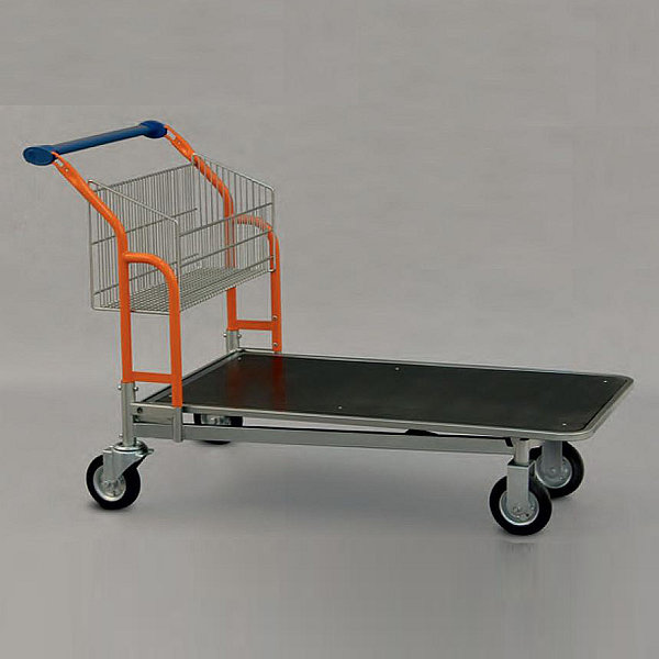 Fikseeritud korviga 118 cm pikkuse platvormiga transpordi- ja laokäru hulgilattu, cash & carry kauplusesse, ehitus- ja aiamarketisse. Platvorm puidust või traadist. Lisavarustuses ostumahtu kasvatav lahtikäiv korv.Omadused